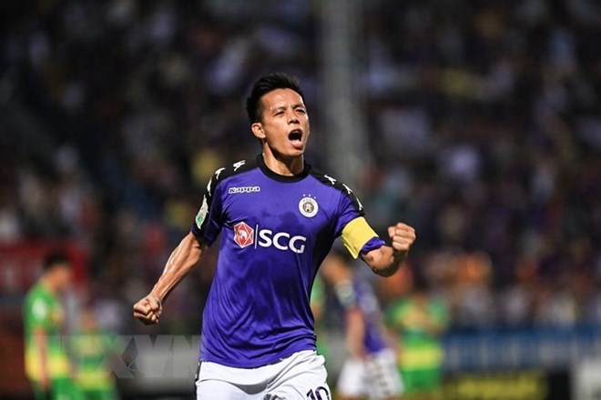 Văn Quyết ăn mừng sau pha làm bàn mở tỷ số trận đấu cho Hà Nội FC. (Ảnh: Trọng Đạt/TTXVN)
