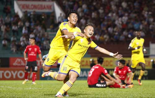 SLNA (áo vàng) giành chiến thắng 2-1 trên sân Long An ở mùa trước