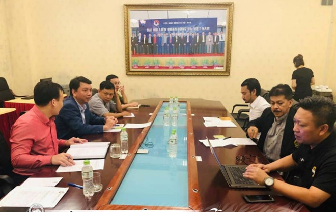 Đại diện VFF (trái) và FAM họp để thảo luận đảm bảo sự an toàn cho tuyển quốc gia và CĐV Malaysia. Ảnh: FAM