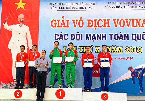 Cặp võ sĩ Nguyễn Văn Tiến - Lê Toàn Trung (từ trái qua) đoạt HCV nội dung Song luyện vật 3 nam tại Giải vô địch các đội mạnh Vovinam toàn quốc năm 2019.