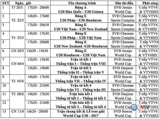 U20 Việt Nam nằm ở bảng E cùng với U20 Pháp, U20 Honduras và U20 New Zealand. Đội bóng Việt Nam sẽ khởi đầu chiến dịch bằng trận gặp U20 New Zealand hôm 22/5. Chúng ta sẽ gặp tiếp U20 Pháp và U20 Honduras trong các ngày 25/5 và 28/5./.
