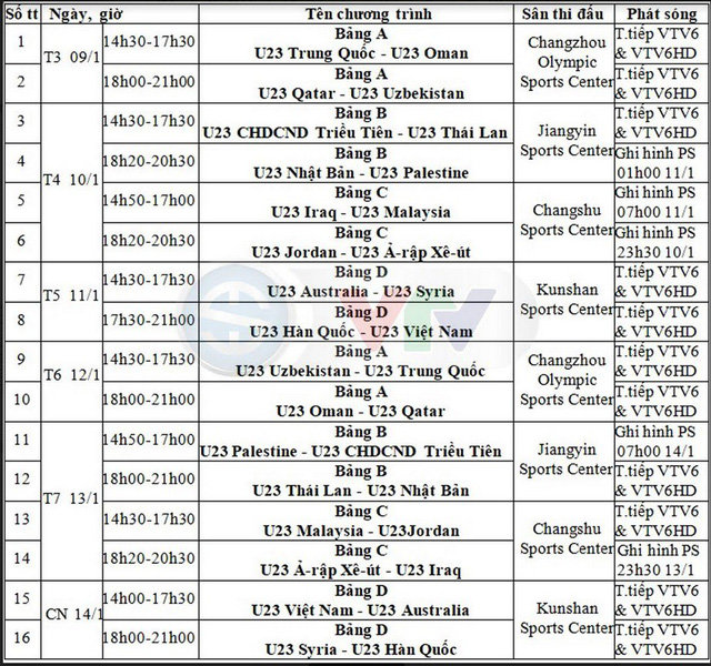 Theo kết quả bốc thăm, U-23 VN rơi vào bảng D cùng U-23 Hàn Quốc, Úc và Syria. Thầy trò HLV Park Hang-seo sẽ gặp U-23 Hàn Quốc ở trận ra quân lúc 18h30 ngày 11/01. Sau đó, lần lượt đụng độ U-23 Úc (15h ngày 14/01) và Syria (18h30 ngày 17/01).