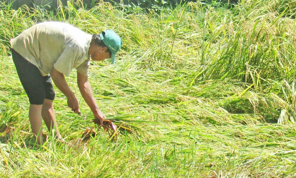 Lúa bị đổ ngã do mưa giông nhưng vẫn được các thương lái mua đúng giá