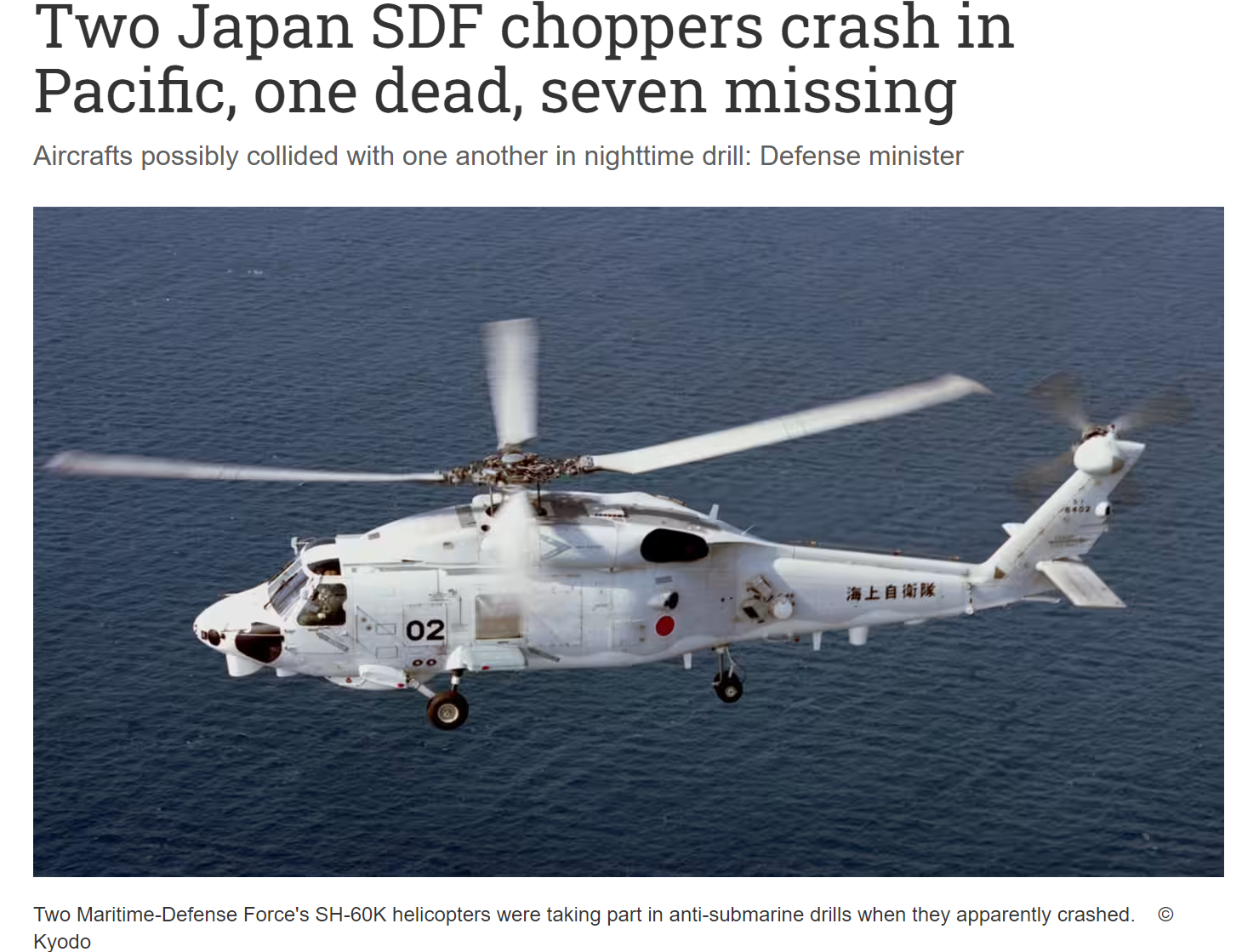 Hãng tin Kyodo dẫn lời Bộ trưởng Quốc phòng Nhật Bản Minoru Kihara cho hay hai trực thăng mất tích là loại 4 chỗ, có số hiệu SH-60K, chở 8 người, đã gặp sự cố khi đang thực hiện công tác huấn luyện tác chiến chống tàu ngầm vào ban đêm trên vùng biển phía Đông đảo Torishima thuộc quần đảo Izu cách Tokyo khoảng 600 km về phía Nam.