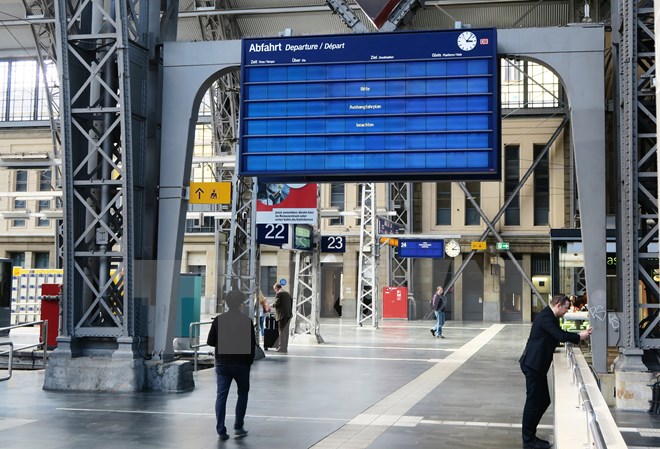 Bảng điện tử tại nhà ga Frankfurt am Main bị ảnh hưởng bởi vụ tấn công mạng, ngày 13/5. (Nguồn: EPA/TTXVN)