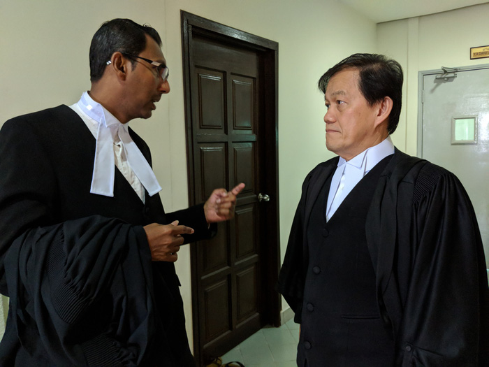 Luật sư Hisyam Teh Poh Teik (phải) tranh luận với đồng nghiệp bên ngoài phiên tòa thượng thẩm Shah Alam - Ảnh: LÊ NAM