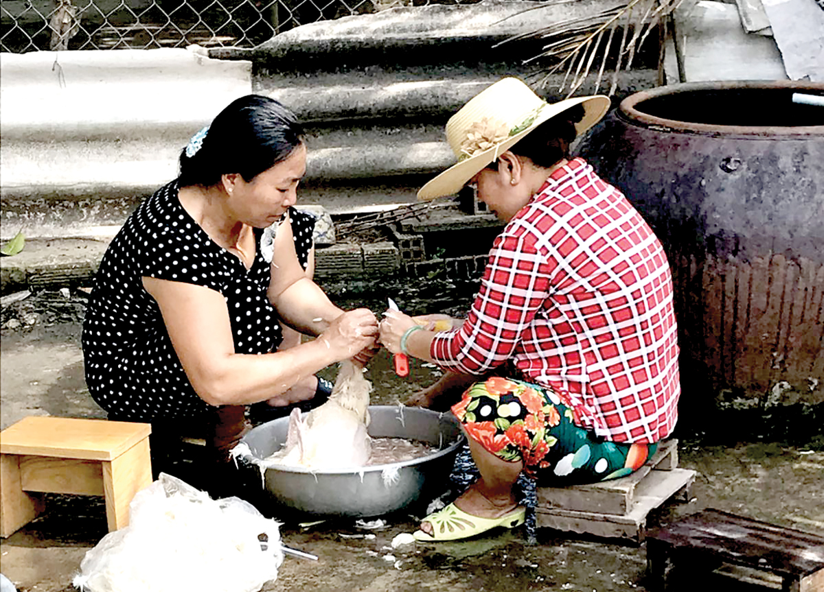 Chị Bích Thủy (không đội nón) cùng em chồng làm vịt nấu đám tiệc. Gần 30 năm làm dâu, chị được các em chồng rất thương quý.