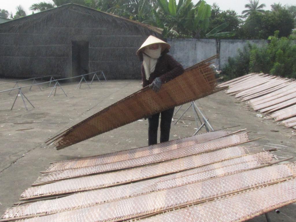 Chị Bùi Thị Hồng - cũng làm việc tại cơ sở Bé Tư cho biết thêm: “Mặc dù công việc không nặng nhọc nhưng phải làm liên tục, nhất là khâu phơi bánh, nếu đảo bánh không khéo và thường xuyên, không theo dõi kỹ độ nắng thì bánh sẽ hỏng”.