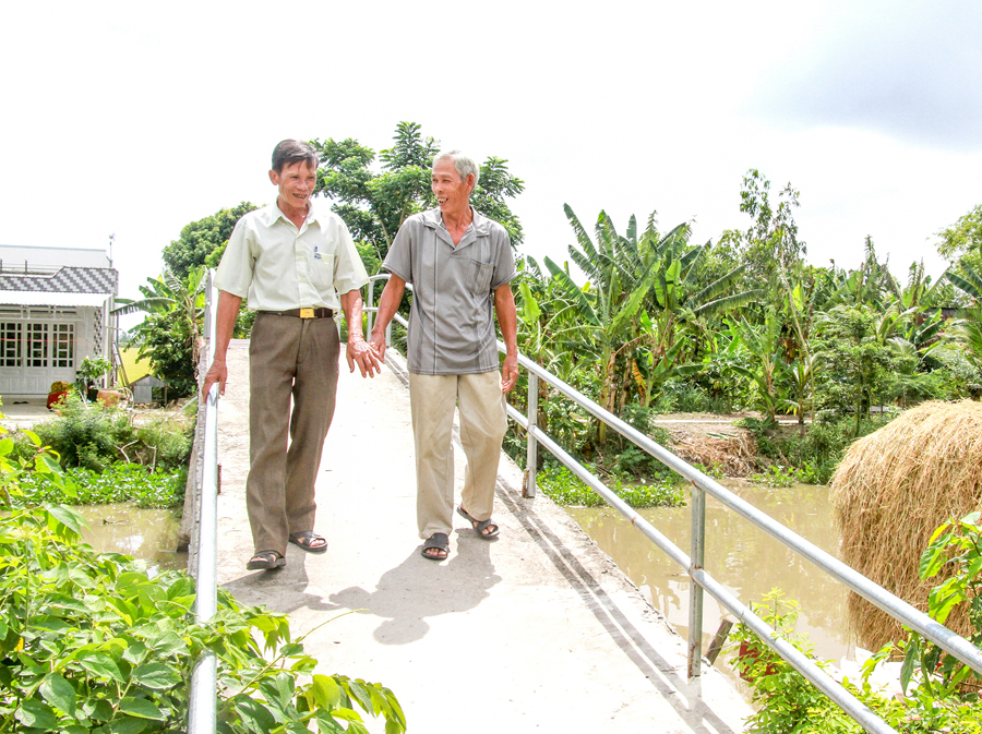 Ông Đặng Khắc Phán, Trưởng ban công tác Mặt trận ấp 1, xã Thạnh Phú, huyện Cờ Đỏ (bên trái) cùng người dân phấn khởi khi đi trên cây cầu mới được xây dựng.
