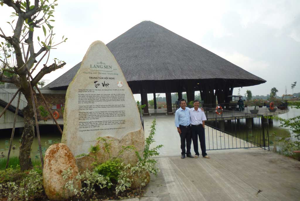 Xe chạy một vòng cho khách ngắm toàn cảnh Đức Hòa Đông hiện hữu. Tôi thích những ngôi nhà song lập truyền thống với vườn cau trầu và cây ăn trái bao quanh. Ở Đức Lập Hạ nhiều nơi vẫn giữ nét như vậy. Rồi xe chạy vào khu “Làng Sen Việt Nam”. Hẳn đây là dự án khu du lịch sinh thái mang sắc thái Việt Nam? Từ xa thấy nổi bật trên nền xanh cây cỏ tạo cảnh là một ngôi nhà tròn làm hoàn toàn bằng tre và tranh, rất ấn tượng. Đây là Trung tâm Hội nghị Tre Việt Nam, do nhóm Kiến trúc sư Võ Trọng Nghĩa thiết kế và Công ty CP Gió và Nước thi công trong vòng 240 ngày. Ở hai bên lối vào là hai bức tường dán kín phối cảnh toàn khu phức hợp nhiều công năng xanh, nên cái nào cũng mang tên“Xanh”: Du lịch xanh, làng xanh, nhà xanh, biệt thự xanh,… và các làng cổ, làng nghề truyền thống Việt đều xanh, chiếm một khu đất rộng lớn.