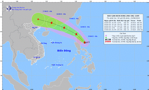 Theo Trung tâm Dự báo Khí tượng Thủy văn Quốc gia, vào 1 giờ ngày 23/8, vị trí tâm bão Maon ở khoảng 16,3 độ Vĩ Bắc; 123,0 độ Kinh Đông. Sức gió mạnh nhất vùng gần tâm bão mạnh cấp 9 (75-88 km/giờ), giật cấp 11.