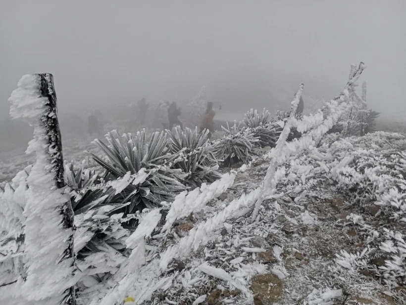 Băng giá xuất hiện trên đỉnh Mẫu Sơn từ chiều 22/1/2024. (Ảnh: Anh Tuấn/TTXVN)
