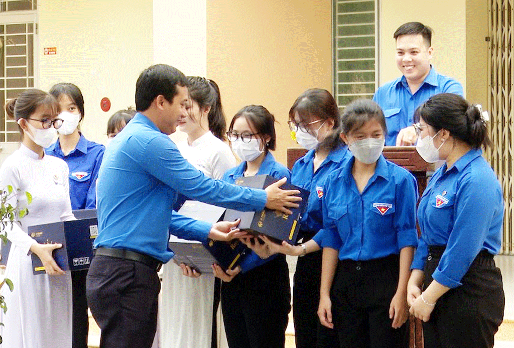 Bí thư Tỉnh Đoàn - Trần Hải Phú trao nón bảo hiểm cho học sinh trong buổi tư vấn tâm lý mùa thi