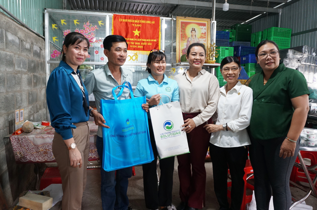 Giám đốc đối ngoại Công ty VWS - Trương Thị Ngọc Hằng (thứ 2, từ trái qua) tặng quà cho hộ dân ấp 2, xã Mỹ Thạnh