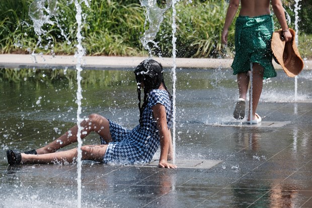 Người dân làm mát dưới đài phun nước khi nắng nóng gay gắt ở Nice, miền Nam Pháp ngày 17/6/2022. (Ảnh: THX/TTXVN)