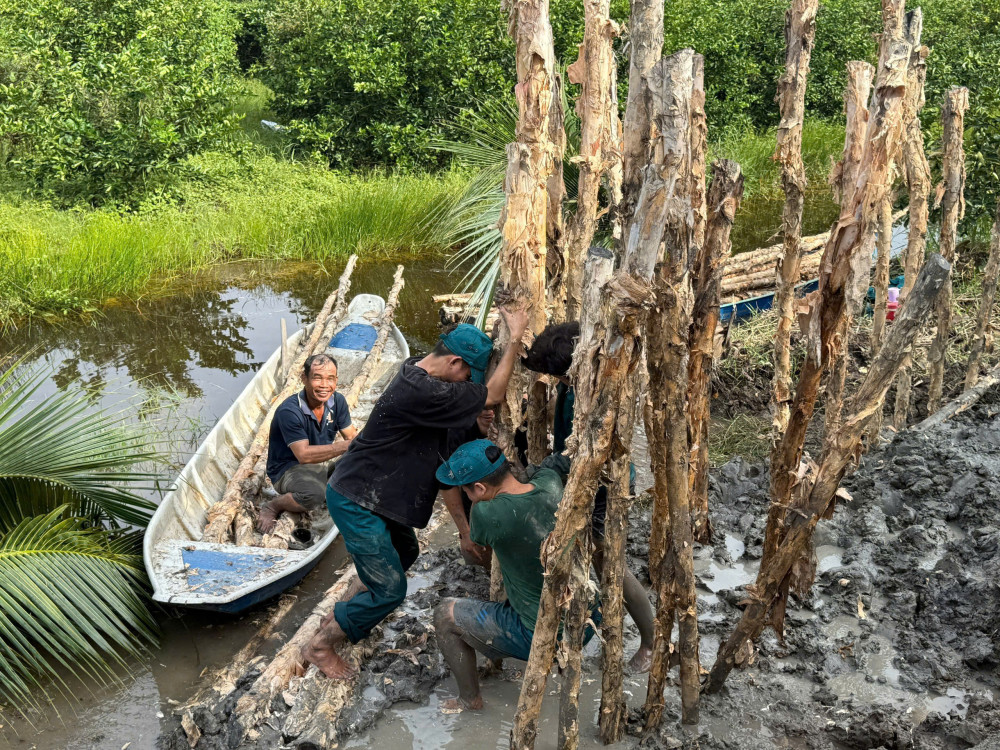 Lực lượng dân quân cùng người dân đóng cọc, gia cố bờ đê