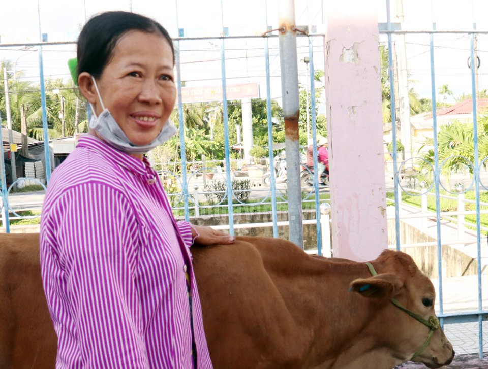 Bà Thạch Thị Bé Sáu rất vui khi được Nhà nước hỗ trợ bò nuôi để nâng cao thu nhập cho gia đình.