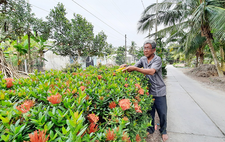 Ông Danh Nâu, ngụ ấp Hòa Út, xã Định Hòa (Gò Quao) hưởng ứng phong trào làm hàng rào cây xanh góp phần xây dựng nông thôn mới.
