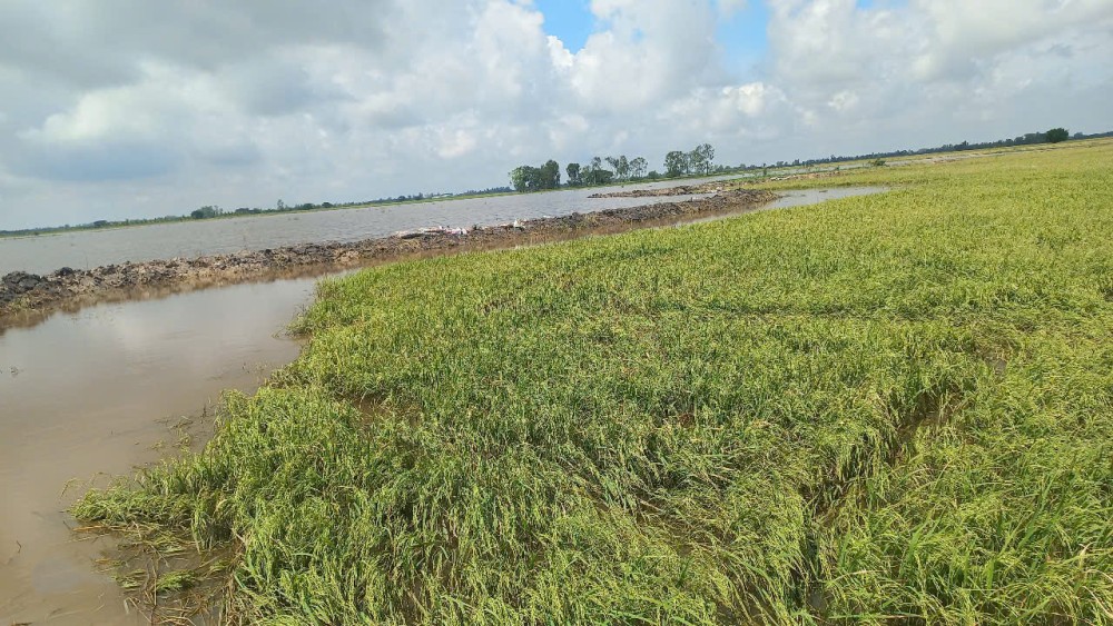 Còn 40ha lúa tại ấp Bưng Ràm, mực nước bên ngoài cao hơn 1m so với mặt ruộng nên nước không thoát được, người dân dùng cơ giới, địa phương huy động lực lượng giúp dân gia cố bờ bao để ứng cứu diện tích lúa này, hạn chế thiệt hại gây ra.