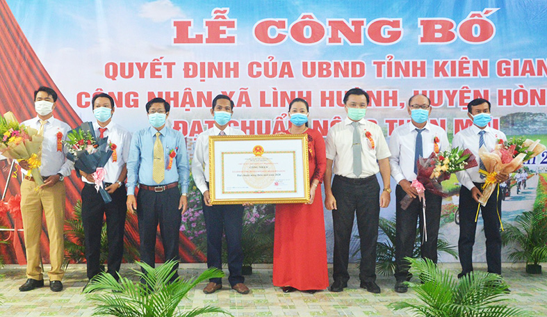 Đồng chí Trương Văn Minh (thứ ba, từ trái qua) – Tỉnh ủy viên, Bí thư Huyện ủy Hòn Đất trao quyết định Ủy ban nhân dân tỉnh công nhận xã đạt chuẩn nông thôn mới cho Ủy ban nhân dân xã Lình Huỳnh. Đồng chí Vũ Thị Thu Trang – Huyện ủy viên, Bí thư Đảng ủy, Chủ tịch Hội đồng nhân dân xã Lình Huỳnh tiếp nhận và đồng chí Huỳnh Thanh Hà – Phó Bí thư Đảng ủy, Chủ tịch Ủy ban nhân dân xã Lình Huỳnh tiếp nhận.