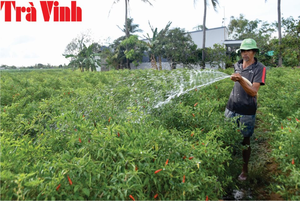 Nông dân Trần Văn Sơn, ấp Bến Kinh, xã Mỹ Long Bắc chăm sóc ớt chỉ thiên.