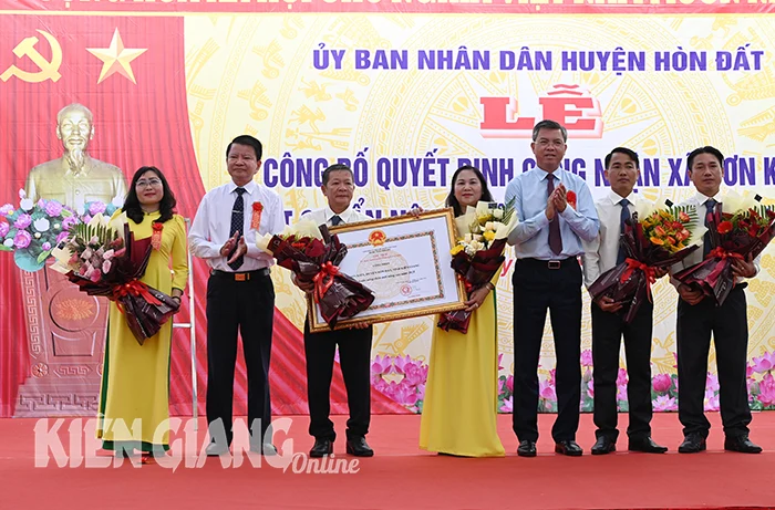 Phó Chủ tịch UBND tỉnh Kiên Giang Nguyễn Lưu Trung (thứ ba, từ phải qua) - Phó trưởng Ban Chỉ đạo các chương trình mục tiêu Quốc gia tỉnh Kiên Giang trao bằng công nhận xã đạt chuẩn nông thôn mới nâng cao năm 2023 cho lãnh đạo xã Sơn Kiên.