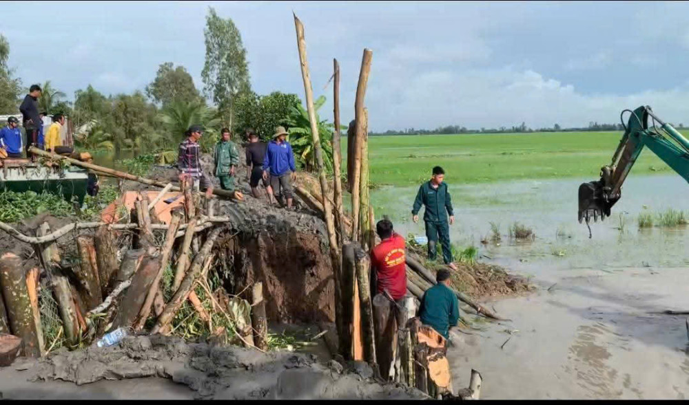 Theo đó, ngày 14/10, một đoạn đê bao trên địa bàn ấp Xóm Mới, xã Vĩnh Châu bị vỡ, nước lũ tràn vào khu vực ruộng lúa khoảng 220ha, nguy cơ ngập úng, gây thiệt hại lớn về kinh tế của người dân.