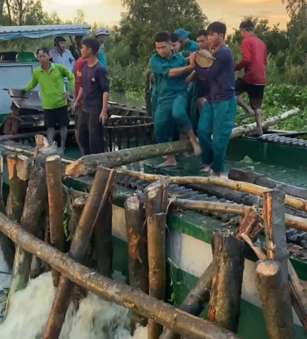 Ngay sau khi tiếp nhận thông tin, UBND xã Vĩnh Châu huy động phương tiện, cử lực lượng phối hợp người dân khẩn trương gia cố, khắc phục đoạn đê bao bị vỡ, đồng thời tiến hành bơm rút nước, tránh tình trạng ngập úng cho lúa.