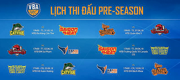 (CT)- VBA 2018 đã chính thức có lịch thi đấu giao hữu giữa 6 đội bóng trước khi giải diễn ra. Theo đó, mỗi đội sẽ có 2 trận, một trên sân nhà và một trên sân khách.