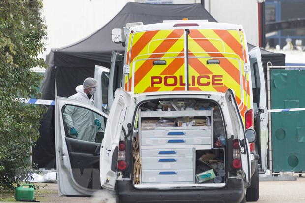 Nhân viên pháp y thuộc Cảnh sát Anh điều tra tại hiện trường xe container chở 39 thi thể ở Khu Công nghiệp Waterglade thuộc hạt Essex, miền Đông Nam nước Anh ngày 23/10/2019. (Nguồn: THX/TTXVN)