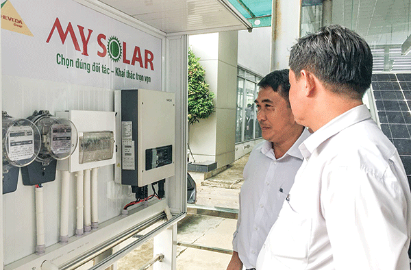 Khách hàng tham quan khu giới thiệu, trưng bày thiết bị lắp đặt điện năng lượng mặt trời trên mái nhà tại PC Cần Thơ.