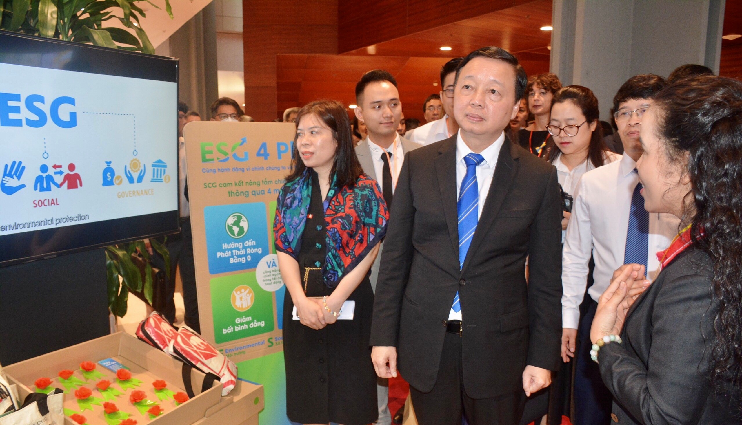| Bộ trưởng Trần Hồng Hà và các đại biểu tham quan gian hàng triển lãm trình diễn về khái niệm, cách tiếp cận và các mô hình kinh tế tuần hoàn. Ảnh: TL |