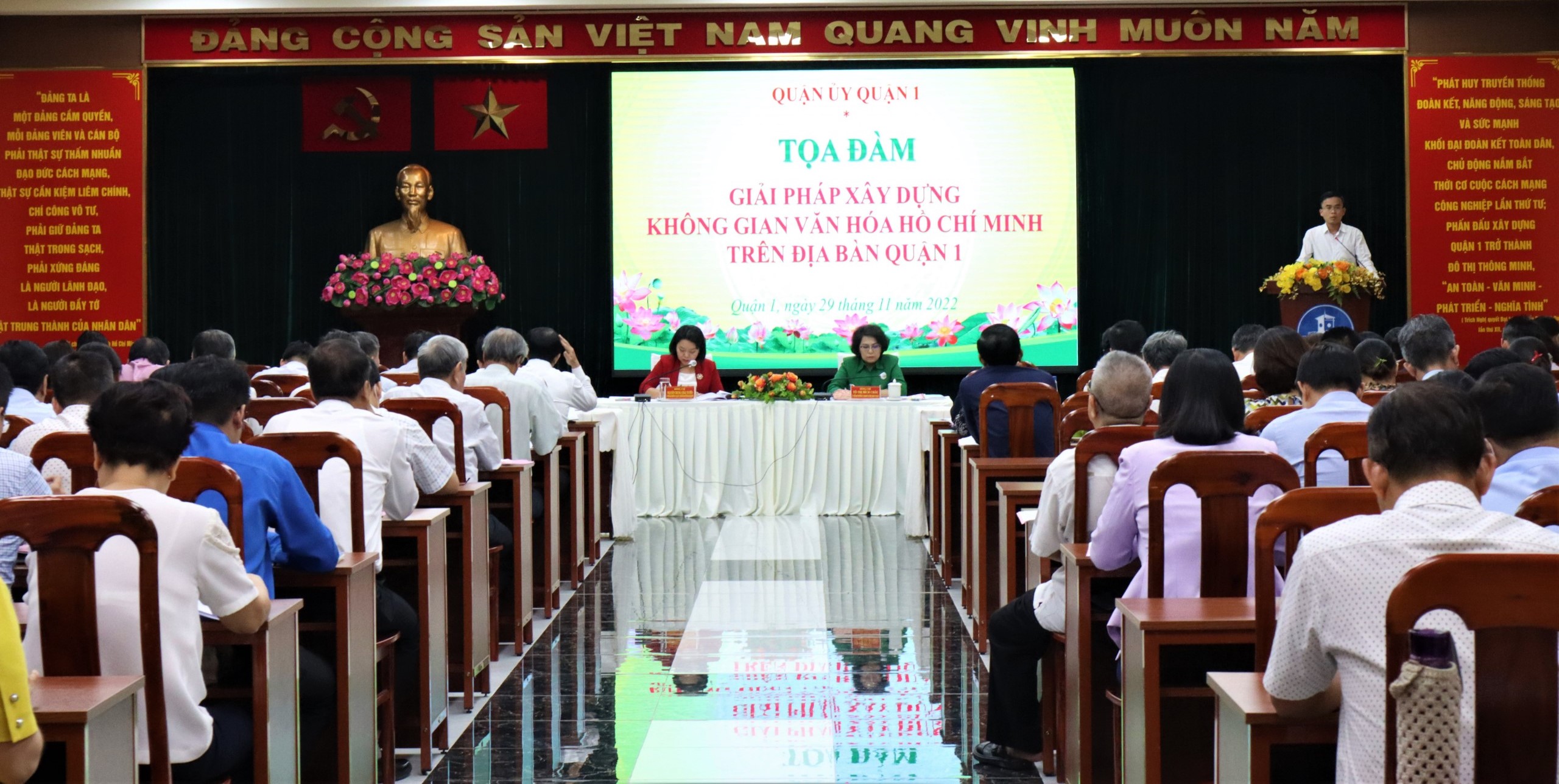 Tại Tọa đàm “Giải pháp xây dựng không gian văn hóa Hồ Chí Minh trên địa bàn Quận 1” diễn ra chiều 29/11, do Quận ủy Quận 1 tổ chức, đồng chí Tô Thị Bích Châu, Bí thư Quận ủy Quận 1 yêu cầu các địa phương, đơn vị trên địa bàn phải xác định việc xây dựng không gian văn hóa Hồ Chí Minh trước hết là xây dựng văn hóa trong lãnh đạo, quản lý; chú trọng xây dựng đạo đức công vụ; sát dân, gần dân và kịp thời đáp ứng các nguyện vọng chính đáng của người dân là nhiệm vụ hàng đầu.