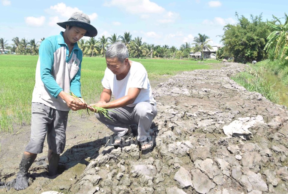 Tuyến đê bao khép kín bảo vệ vùng sản xuất lúa của người dân ấp Chòm Chuối (trong ảnh: ông Dương Văn Cộng (phải) kiểm tra lúa của thành viên tổ đê bao).