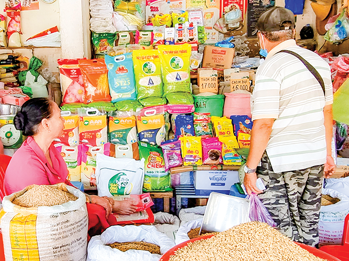 Thời gian qua, nhiều loại gạo có bao bì và nhãn hiệu đã bán được giá cao hơn so với gạo không có nhãn hiệu. Trong ảnh: Gạo được bán tại Trung tâm thương mại Cái Khế, TP Cần Thơ.