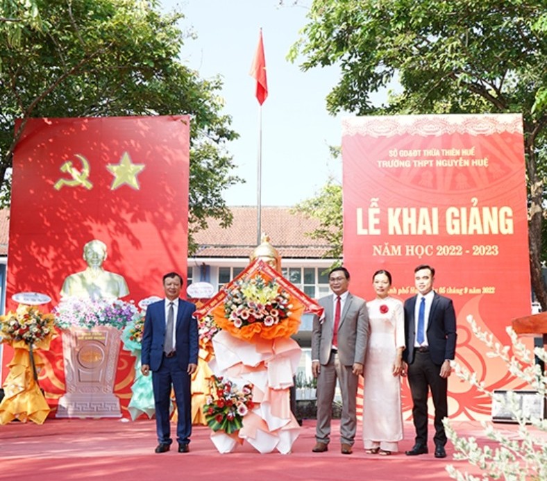 Tại lễ khai giảng, Bí thư Tỉnh ủy Lê Trường Lưu đã tặng lẵng hoa chúc mừng và trao các suất học bổng cho các em học sinh nghèo đang theo học ở trường, nhằm động viên các em phấn đấu vươn lên trong học tập năm học 2022 - 2023. Đồng thời, đã trao cờ “Đơn vị dẫn đầu phong trào thi đua khối các đơn vị trực thuộc Sở Giáo dục và Đào tạo” năm học 2021 - 2022 của UBND tỉnh cho Trường THPT Nguyễn Huệ.