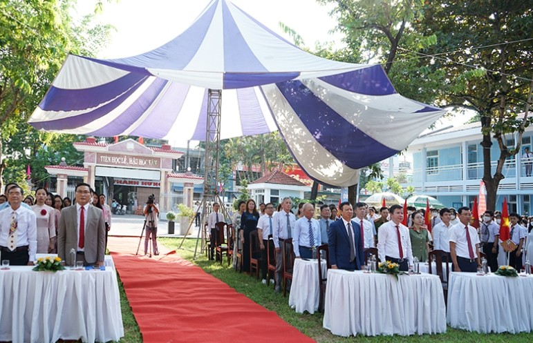| Các đại biểu đến tham dự Lễ khai giảng năm học mới 2022-2023 tại trường THPT Nguyễn Huệ. |