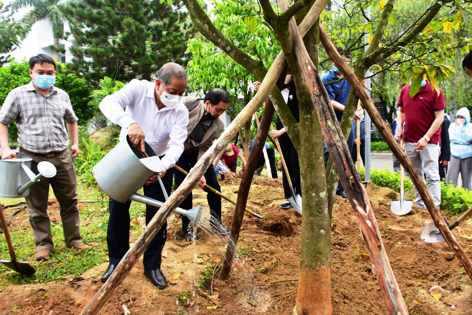 | Phó Bí thư Tỉnh ủy, Chủ tịch UBND tỉnh Thừa Thiên Huế Phan Ngọc Thọ trồng hoàng mai trong khuôn viên Bệnh viện Trung ương Huế sau khi phát động phong trào trồng “Mai vàng trước ngõ” hồi đầu tháng 3/2021. (Ảnh: Diên An) |
