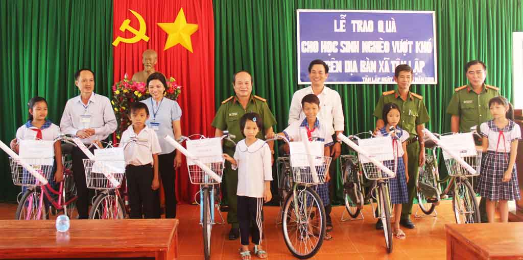 Nhờ sự giúp đỡ của nhà trường và chính quyền địa phương, em Lê Thị Ngọc Trâm (thứ 3, hàng đầu, phải qua) được nhận nhiều suất học bổng cùng những phần quà ý nghĩa