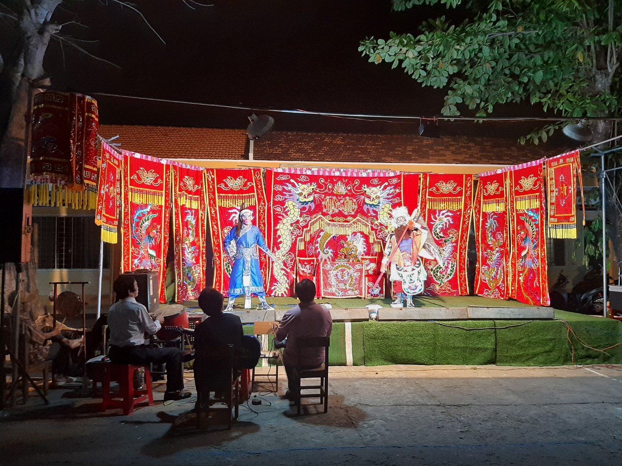 Đoàn hát bội phục vụ lễ hội năm nay là đoàn Thái Vinh. Các nghệ sĩ hát bội trong đoàn đều đam mê và khao khát giữ gìn chút duyên với nghề truyền thống. Bởi sau mùa cúng Kỳ Yên tháng Giêng, hầu hết nghệ sĩ sẽ cất “áo mũ cân đai” trở về với cuộc sống đời thường, không ánh đèn sân khấu.