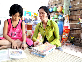 | Chị Cao Thị Diệu tranh thủ lúc rảnh dạy con gái học bài. |