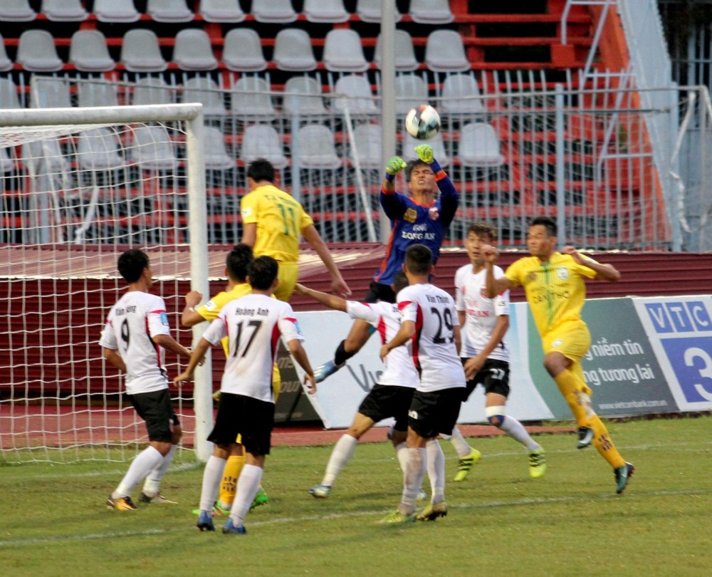 Thủ môn Long An cứu thua trước sự uy hiếp của các cầu thủ Cần Thơ (áo vàng).