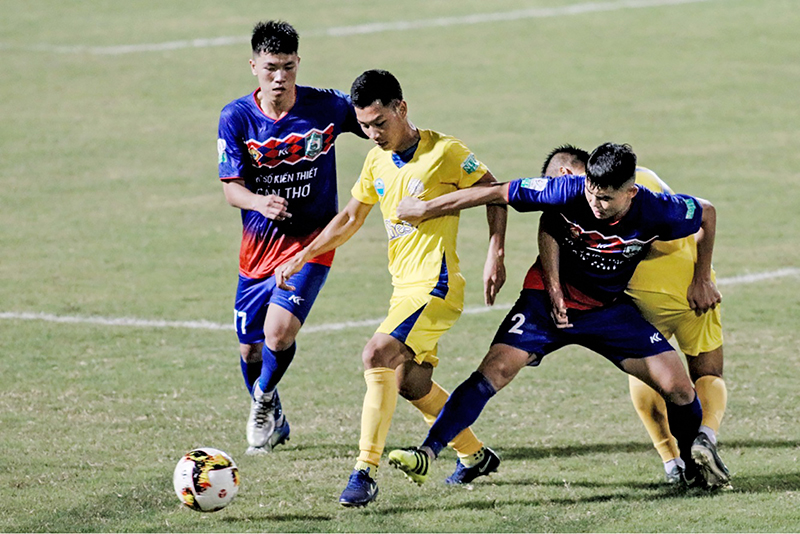 Hậu vệ Ngọc Bảo (số 2) của Cần Thơ vất vả trong trận đấu với Khánh Hòa vòng 17. Ảnh: DƯƠNG THU