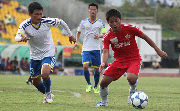 Cầu thủ của XSKT Cần Thơ (phải) đi bóng trong trận đấu gặp Huế trên sân Cần Thơ mùa giải hạng Nhất 2014. Trận này, Cần Thơ thắng 4-1.