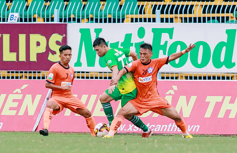 Tiền vệ Thanh Long (giữa) là một trong những phương án thay thế Hữu Dũng của XSKT Cần Thơ. Ảnh: NGUYỄN MINH