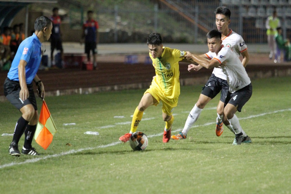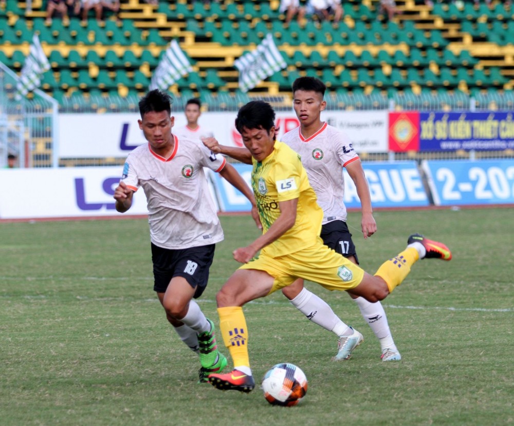 Pha đi bóng vượt qua hậu vệ đối phương của Thanh Long (áo vàng) bên phía Cần Thơ. Ảnh: Nguyễn Minh
