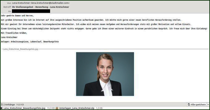 Dòng mã độc tống tiền mới này xuất hiện dưới dạng các chiến dịch lừa đảo email độc hại. Các email này mang nội dung là đơn xin việc của Lena Kretschmer có kèm theo hồ sơ ở dạng tập tin ZIP, và có chứa một tập tin đường dẫn LNK. Tuy nhiên, tập tin LNK là một “cái bẫy” và sẽ cài đặt mã độc tống tiền GermanWiper vào máy tính nạn nhân. Khi chạy, nó sẽ viết lại nội dung của các tập tin trên máy tính người dùng thành các ký tự 0x00, và đổi phần đuôi từ 3 ký tự thành chuỗi 5 ký tự chữ và số ngẫu nhiên như *.08kJA, *.AVco3, *.OQn1B, *.rjzR8…