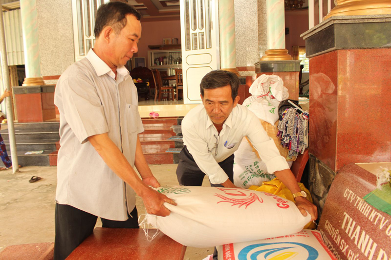 CCB phường Long Hưng chuẩn bị gạo để hỗ trợ cho người có hoàn cảnh khó khăn.