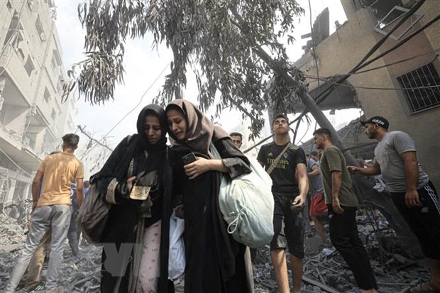 Người dân Palestine rời bỏ nhà cửa ở Dải Gaza nhằm tránh cuộc xung đột Hamas-Israel, ngày 9/10/2023. (Ảnh: AFP/TTXVN)