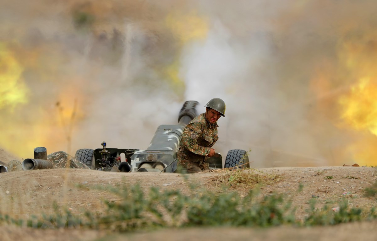 Lực lượng Armenia nã pháo về phía tiền đồn quân đội Azerbaijan trong cuộc xung đột tại khu vực tranh chấp Nagorno-Karabakh. (Ảnh: AFP/TTXVN)